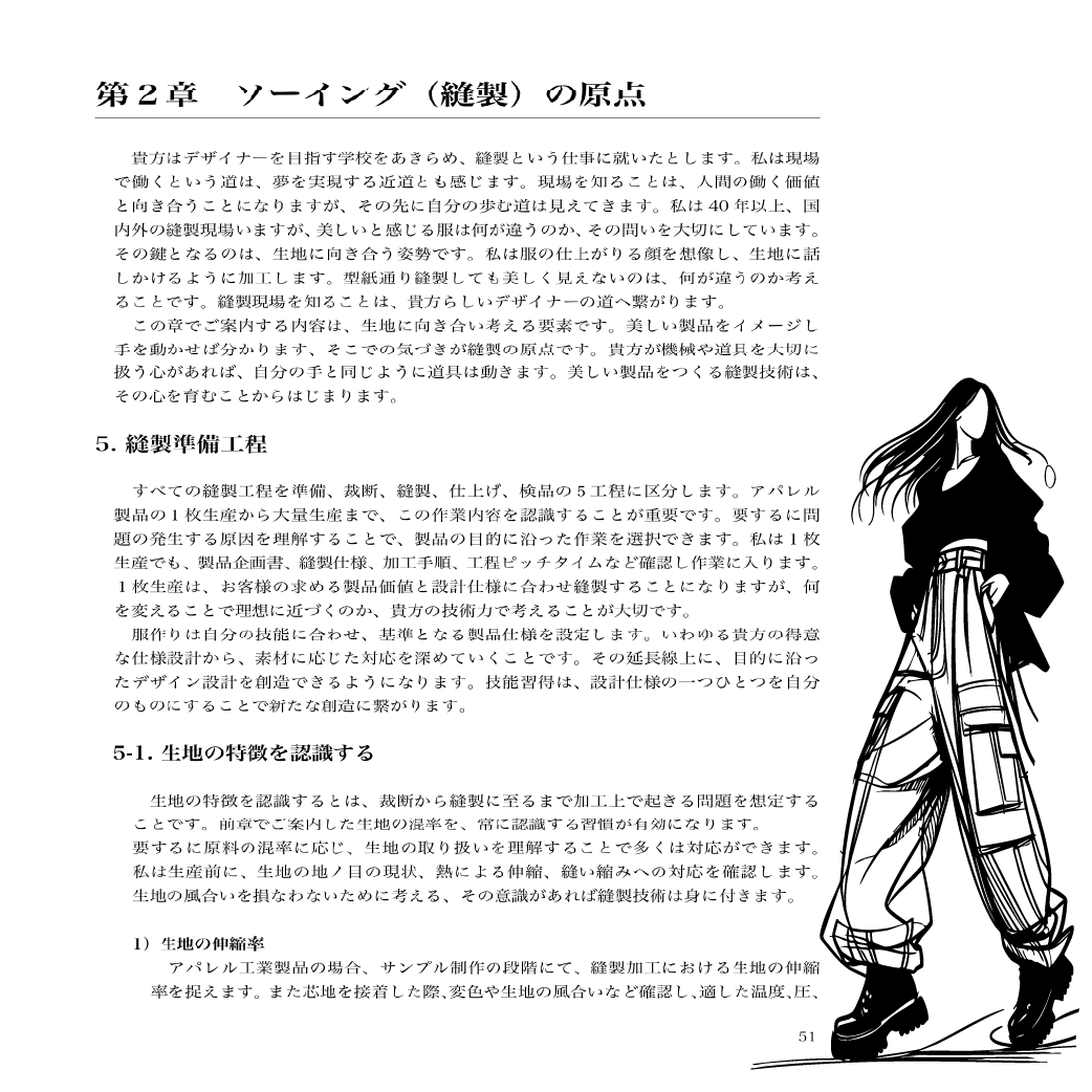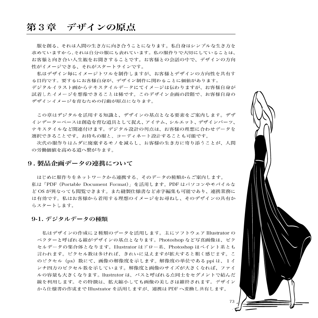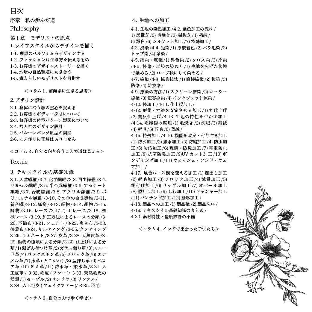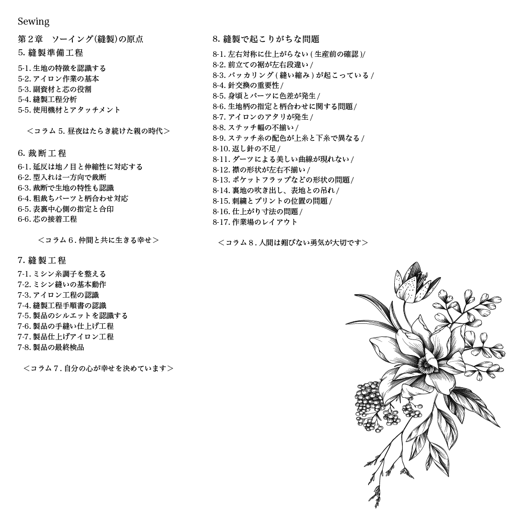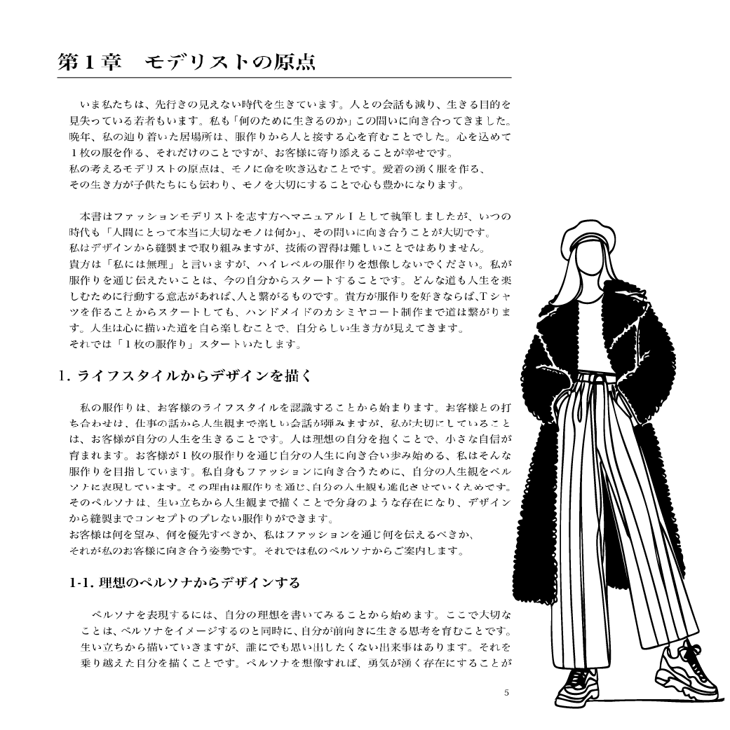 作品は、全五章20項目で構成されています。お客様のライフスタイルからデザインを描く「モデリストの原点」から始まり、縫製準備工程から裁断工程、縫製工程へと続く「ソーイング(縫製)の原点」、自分の服を創ることは生き方に向き合うことと位置づけられた「デザインの原点」、アトリエを自分らしく生きる場所とし、自分らしいライフブランドをつくることを目指す「モデリストという生き方」、そして「人と共存する生き方」の最終章へと展開します。