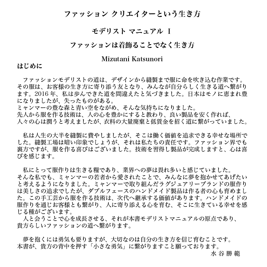 1986年、モノ作りにおける「利益の追求」から中国に進出した著者は、そこで日本が進む道は大量生産ではないと痛感し、オーダーメイドさらには一枚生産への道を歩み始めました。ミャンマーでは、自身が歩んできた道の誤りにも気付かされます。「日本はモノに恵まれ豊かになったが、失ったものがある。服を作る技術は人の心を豊かにすると教わり、良い製品を安く作れば、人々の心は潤うと考えてきたが、衣料の大量廃棄と低賃金を招く道につながっていた」(「はじめに」)と語ります。