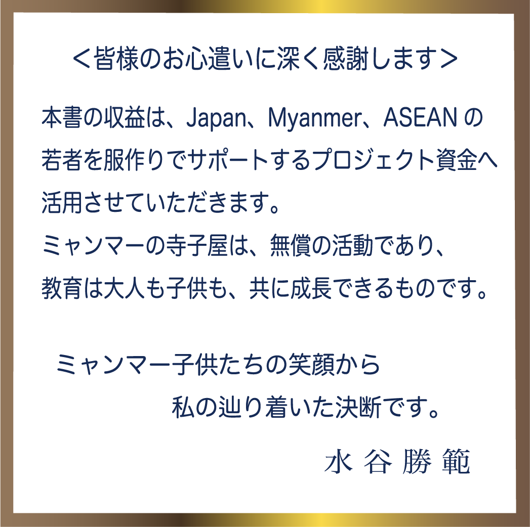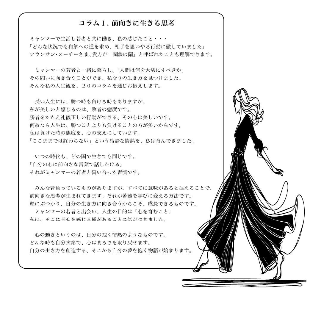 また本作には、ミャンマーで著者が「人間は何を大切にすべきか」という問いと向き合い、著者なりに見つけた生き方・人生観が20のコラムとして綴られています。〈前向きに生きる思考〉〈自分に向き合うことで、道は見えてきます〉〈自分の力で歩く幸せ〉〈仲間と共に生きる幸せ〉〈自分の心が幸せを決めています〉〈人間は媚びない勇気は大切です〉〈私にも消費社会を変えるチャンスはある〉〈服にも心が宿る〉〈人は人、自分は自分という生き方〉〈信念があれば、心は強いものです〉――。分かり易い助言とともに、〈人として大切なこと〉では、見返りを求めないこと、他人を理解する努力は、自分を知ることと繋がるという視点が示されます